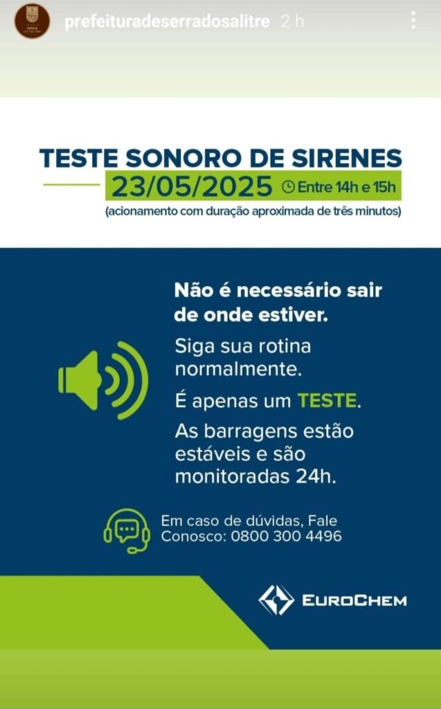 Houve uma manutenção das sirenes iniciadas dia 19/05 com previsão de termino pro dia 23/05 tornando viável e necessário o teste de acionamento das sirenes, o teste da próxima sexta-feira tem como objetivo verificar a funcionalidade e a cobertura sonora das sirenes, além de familiarizar a população com o som do alerta de emergência. A EuroChem Salitre reforça que este será apenas um teste, e não há motivo para alardes durante o acionamento programado.